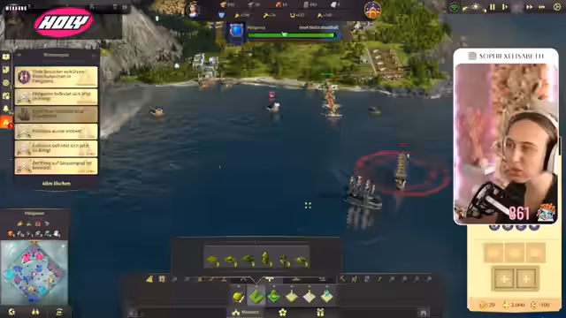 08:38:21Es wird die Eroberung einer Insel in Erwägung gezogen, um dort ein Gefängnis zu errichten und einen Pendlerkai zu bauen. Es wird diskutiert, ob die Schiffe des Pendlerkais angreifbar sind. Die Streamerin entscheidet sich, die Insel zu erobern und beginnt mit dem Bau eines Händlerkais. Ein Linienschiff wird zur neuen Insel geschickt, um diese zu sichern. Es wird festgestellt, dass der Kanonenturm in der neuen Welt keine Stahlträger benötigt. Die Streamerin ärgert sich, dass sie das nicht schon früher bemerkt hat. Es wird überlegt, einen Besucherhafen zu bauen. Die Streamerin plant den Bau von Kanonen auf der neuen Insel. Es wird festgestellt, dass die Routen zwischen den eigenen Inseln relativ sicher sind, da der blaue Gegner hauptsächlich in seinen eigenen Gebieten unterwegs ist.