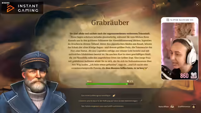 02:15:45Die Protagonistin hat das Geld, um Schiffe zu kaufen. Es gibt Pläne für neue Expeditionen und Ausbildung. Die Königin ist verschwunden und Sir Archibald bittet die Protagonistin, sie zu finden. Die Protagonistin nimmt das neue Schiff Mirabelle. Sie bedankt sich für einen Primey. Sie fragt, ob man die Speicherstadt schon bauen kann und ob es sich lohnt, den neuen Teil 117 vorzubestellen. Sie ist sich nicht sicher, ob es Vorbestellerboni gibt. Sie nimmt Sekt und Jagdglück für die neue Expedition mit. Sie überlegt, ob sie die Expedition instant kaufen soll. Sie fragt, was für ein Schiff eine Fregatte ist. Sie will um die Speicherstadt herumkommen. Sie kauft das Schiff Schluckspecht. Sie kann mit dem Schiff weitere Aufgaben machen. Sie soll 37 Tonnen Kanonen liefern. Sie versteht die Speicherstadt nicht. Sie will erst in der Neuen Welt anfangen aufzubauen. Sie soll eine kleine Siedlung errichten. Sie baut einen Marktplatz und Hirtenhäuser. Sie soll Wanzerholz produzieren. Sie hat beim letzten Mal schon neu begonnen. Sie soll ein Duell fotografieren. Sie nimmt eine Fremdenführerin mit. Sie soll Ziegenmilch produzieren. Sie hat zu wenig Menschis. Sie soll bewässern. Sie hat lange nichts mehr von ihrer Expedition in die Neue Welt gehört. Sie überlegt, Kanonen herzustellen und zu verkaufen. Sie hat genug Eisen, Stahl und Kohle. Sie ballert eine Kanonengießerei hin. Sie findet es gut, Schiffe abzukaufen. Sie hat zu wenig Kanonen. Sie soll ein Stadtteil an die Wasserpumpe anschließen und 50 Kanalfelder auf bewässertem Boden errichten. Sie will erst ihre Expedition ready machen. Sie will die Explosion mit der Königin nicht. Sie will endlich in die alte Welt. Sie soll einen Einheimischen fragen, ob er eine flüchtige Königin gesehen hat. Sie soll eine Spur finden. Sie vermutet, dass die Königin ihren Cousin Orne Ernest besucht. Sie übergibt ihm einen Brief von Sir Archibald. Er führt sie durch Räume mit vergoldeten Kandelabern.