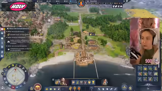 07:58:42Die Streamerin kauft ein neues Flaggschiff, eine Trireme, stellt aber fest, dass auch diese keine Waffen hat und nicht angreifen kann, ohne Truppen an Bord. Sie schickt die Trireme zurück und beschließt, die Forschung voranzutreiben, um Schiffsskorpione freizuschalten, die ihren Schiffen Angriffsfähigkeiten verleihen sollen. Die Forschungszeit beträgt über drei Stunden. Sie reißt die fälschlicherweise besiedelte Insel ab und plant, die korrekte Questinsel zu besiedeln, die Sumpf und Biberpopulationen bietet. Die neue Quest erfordert die Ansiedlung von 30 Wanderern auf der Insel des Heiligen Heinz und die Lieferung von Opfertier Ochsen. Sie entscheidet sich, ein Phanum zu bauen, um sich mit den keltischen Stämmen gutzustellen, anstatt sie zu zerstören, was eine alternative Kampagnenoption darstellt. Die Kampagne bietet unterschiedliche Wege, was sie spannend findet.