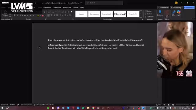 01:45:35Während der Stream eine persönliche Anekdote einfließen lässt: Ihre Mutter hat sich ein Elektro-Tandem gekauft, um trotz Knieproblemen weiter Fahrradtouren unternehmen zu können, was die Streamerin begeistert. Nach der finalen Content-Planung beginnt der Übergang zum Skriptschreiben für das Video zu Farmer's Dynasty 2. Der Stream endet damit, dass sie die Strategie des Videos darlegt: einen Rage-Content-Stil zu nutzen und das Spiel als ernsthaften Konkurrenten zum Landwirtschaftssimulator zu präsentieren, ohne dabei einen Exklusivvertrag zu verletzen.