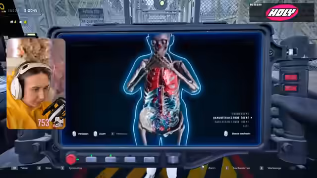 04:56:36Mehrere Personen werden in die Quarantäne geschickt, da sie verdächtige Symptome aufweisen, wie z.B. eine Person mit roter Haut, die aber nicht übergewichtig ist. Die Streamerin diskutiert intensiv über die Interpretation von Symptomen wie Fettleber versus nekrotischem Gewebe und versucht, durch UV-Licht-Scans und andere Checks, genaue Diagnosen zu stellen. Sie trifft Entscheidungen basierend auf den sichtbaren Anzeichen und der Auslastung der Quarantänezone.
