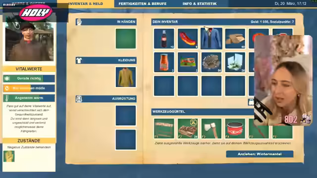 03:05:05Nach der Reparatur des Hühnerstalls wird Jeremy informiert. Er schenkt dem Protagonisten einige Hühner, nachdem dieser ihm eine Kiste mit Eiern gebracht hat. Der Protagonist fühlt sich müde und erkennt, dass Schlaf nötig ist, um effektiv spielen zu können. Die Streamerin gibt ein vorläufiges Fazit: Das Spiel wird als trashiger Simulator bezeichnet, der aber dennoch amüsant sein kann. Die Mechanik der Beziehungen wird als interessant angesehen, während die Menüführung und der Feinschliff des Spiels kritisiert werden.