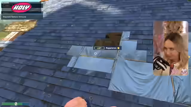 08:08:48Zurück im Spiel versucht die Streamerin, die letzte Quest-Aufgabe, das Entfernen einer Spinnenwebe, abzuschließen. Sie stößt jedoch auf ein Rätsel, da sie die Spinnenwebe nicht erreichen kann und an verschiedenen Stellen kein Gerüst aufstellen kann. Sie ist frustriert über das Problem, da es die Reparatur des Silos blockiert und sie weitere Vorschläge der Zuschauer prüft, wie das Springen auf ein Auto, was jedoch scheitert.
