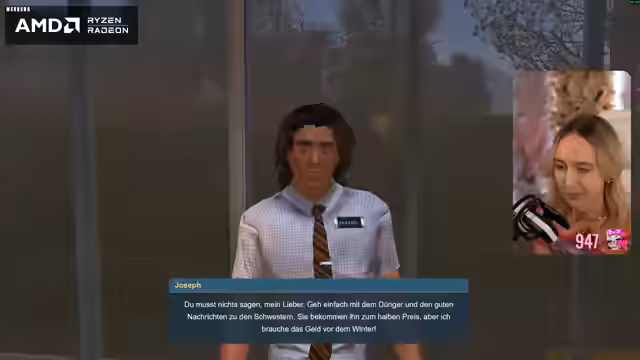 09:27:05Die Streamerin nimmt eine neue Quest an, bei der sie Audrey und Claire helfen soll, deren Manufaktur zu retten. Die Probleme der Schwestern sind ein unfruchtbarer Obstgarten und hohe Kosten für gekauftes Obst. Die Streamerin spricht zunächst mit Jack, der ihr rät, seinen Bruder Joseph zu überzeugen. Dieser zeigt sich zunächst stur, lässt sich aber nach einem Gespräch mit Jack durch die Drohung, Jack selbst würde die Kosten übernehmen, bewegen. Die Streamerin erhält als Belohnung eine Sämaschine, was ein wichtiger Meilenstein für den Bauernhof darstellt.