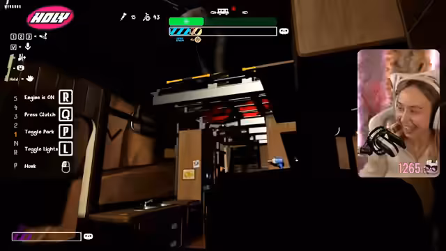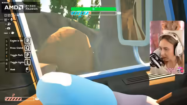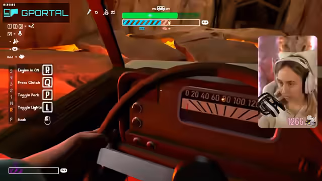 09:09:13Auf dem Weg nach oben wird das Fahrzeug von einem Bären angegriffen, was zu erheblichem Schaden führt. Die Streamerin muss das Fahrzeug anhalten, um es zu reparieren. In diesem Zusammenhang wird sie auch von Feuer getroffen und erhält einen Debuff, den sie mit einer Creme bekämpfen muss. Die Situation bleibt angespannt, da der Bären-Gefahr weiterhin besteht.