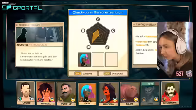 05:26:50Schwierigere Aufträge treten auf, wie die Bekämpfung von Bewusstsein erlangenden Lieferbots, die Renovierung eines Spukhauses und die Rettung von Geiseln auf einer Yacht. Die Spielerin muss dabei Ressourcen managen und Helden mit spezifischen Attributen wie Intellekt oder Charisma auswählen. Ein Chat-Frage zum Giveaway wird direkt beantwortet: Es gibt heute kein Giveaway, was als klare Ankündigung dient.