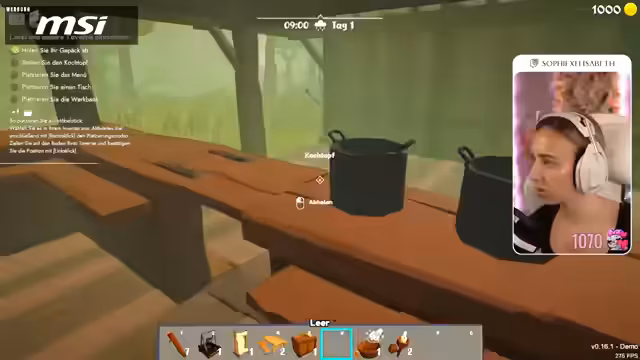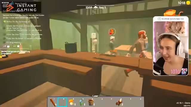 05:12:50Der Stream beginnt mit dem Aufbau einer Taverne. Zunächst werden Krüge für Apfelsaft gefertigt und Getränke in die Speisekarte aufgenommen. Der erste Kunde begrüßt man herzlich und es stellt sich schnell die Herausforderung, die nötigen Zutaten wie sauberes Wasser für die Spülwanne und Blumen für Blumenstrüsse zu beschaffen. Der Fokus liegt auf der Organisation der Arbeitsabläufe im eigenen, noch kleinen Geschäft.