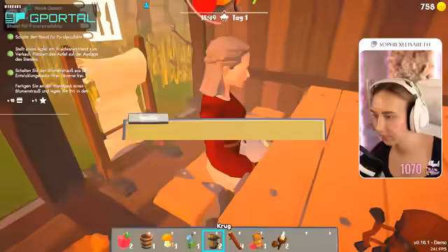 05:07:49In "Medieval Startup" übernimmt man die Leitung einer Taverne in einem sumpfigen Marschland. Das Spiel bietet Platzierungsmöglichkeiten für Möbel und Einrichtungsgegenstände. Der erste Auftrag lautet, Apfelsaft zu kochen, wärend man für die Einrichtung der Taverne verantwortlich ist. Der Streamer stellt fest, dass die Grafik wieder sehr speziell, aber ansprechend ist, und beginnt mit dem Sammeln von Ressourcen wie Äpfeln und der Herstellung von Eimern.
