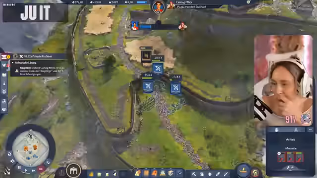 04:34:34Die Spielerin versucht, ihre Truppen in einem Feldlager zu stationieren, um den Arbeitskräftebedarf zu reduzieren, ist sich aber unsicher über die tatsächliche Auswirkung, da die Arbeitskraftanzeige nicht wie erwartet reagiert. Es wird bestätigt, dass Bürger nur dann zur Arbeitskraft zurückkehren, wenn alle Truppen einer Einheit vollständig zerstört wurden. Die Spielerin befürchtet, dass ihre Schiffe von Ballisten im gegnerischen Hafen zerstört werden könnten, bevor sie ihre Landeinheiten absetzen kann. Sie überlegt, einen sicheren Absetzpunkt für ihre Truppen zu finden. Der Kaiser fordert eine hohe Summe von 50.000 Denaren zur Unterstützung seiner Armee, was die Spielerin ablehnt, um ihre eigene militärische Strategie nicht zu gefährden. Sie sammelt weitere Ressourcen und bereitet sich auf den Angriff vor, wobei sie die Notwendigkeit von Landeinheiten für die Eroberung der gegnerischen Stadt betont. Die Spielerin äußert Bedenken hinsichtlich der hohen Kosten und des Risikos des bevorstehenden Angriffs, da sie befürchtet, viele Einheiten zu verlieren.