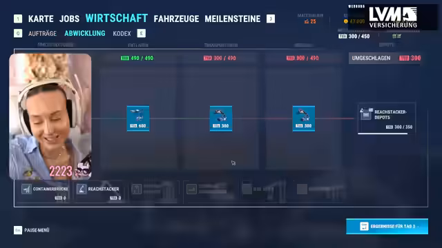 02:23:05Nachdem genug Geld durch die erfolgreiche Auftragsabwicklung verdient wurde, wird ein neuer, teurerer reach-stacker gekauft. Dies führt zu einer Kapazitätssteigerung und ermöglicht die Annahme lukrativerer Aufträge. Die Streamerin äußert eine sehr positive erste Einschätzung zum Spiel, lobt die Steuerung und die Grafik, vermutet aber gleichzeitig, dass es auf Dauer eintönig werden könnte, da man für jeden Auftrag direkt zum Zielort teleportiert wird und nicht frei im Hafen navigieren kann.