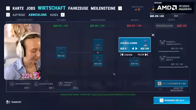 04:02:05Nach einer kurzen Anekdote über eine russische Synchronisation von 'Titanic' konzentriert sich die Streamerin auf das Spiel. Sie stellt fest, dass Verluste zum Spiel gehören und denkt über die Kapazität der verfügbaren Fahrzeuge nach. In einem strategischen Akt kauft sie einen zweiten Straddle Carrier, um die Transportkapazität zu erhöhen, obwohl die Unterhaltskosten steigen. Es folgen erste Versuche mit dem neuen Fahrzeug.