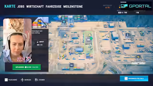 01:39:40Die Streamerin navigiert durch die Spielmechaniken, um Reparaturaufträge am Hafen abzuschließen. Die Steuerung des Reach-Stackers beschreibt sie als etwas kleinfipselig. Sie nimmt einen anfänglichen Frachtauftrag an und arbeitet daran, den täglichen Frachtdurchsatz zu erreichen. Die ersten Aufgaben werden als einfach eingestuft, und sie erkundet den Seefrachtsektor, um Reparaturpunkte zu finden und abzuarbeiten.