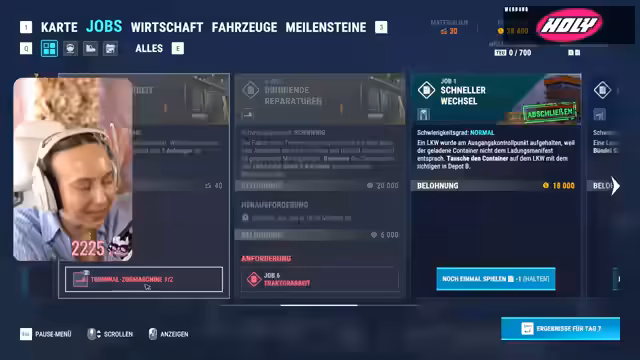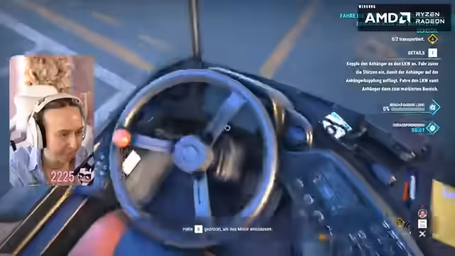 05:14:25Nach erfolgreichem Abschluss des Tages wird die zweite Terminal-Zugmaschine gekauft. Dies schafft die notwendige Voraussetzung, um die anspruchsvolle Mission 'Bergung' zu starten. Bei der ersten Aufgabe dieser Mission, dem Transport von Anhängern, muss die Streamerin die genaue Bedienung der kuppelnden und stützenden Mechanik des Fahrzeugs meistern, was wiederholt zu Verwirrung und Fehlversuchen führt.