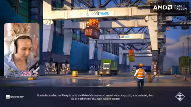 02:09:18Der Stream beginnt mit dem Einstieg in das Spiel 'Docked', bei dem der Hafen nach einem Hurrikan wiederaufgebaut werden muss. Die ersten Schritte bestehen darin, grundlegende Aufgaben wie das Entladen von Schiffen mit der Containerbrücke und das Abtransportieren vonContainern zu bewältigen. Dabei werden auch erste Schwierigkeiten wie das Handling eines reach-stackers und das Einsammeln von Containern angesprochen, die den LKW blockieren und zur Barge transportiert werden müssen.