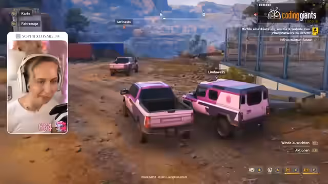 02:56:02Nachdem die technischen Probleme vorübergehend gelöst scheinen, konzentrieren sich die drei Spieler auf die Missionsziele. Carina übernimmt die Aufgabe, eine Route für autonome Fahrzeuge zu planen. Die Streamerin beobachtet diesen Prozess begeistert und ist beeindruckt, wie Carina eine saubere Route erstellt. Sobald der Konvoi gestartet ist, fahren die Fahrzeuge automatisch entlang der gesetzten Wegpunkte und die Streamerin lobt die schicke, cinematicen Darstellung dieses Vorgangs. Die Teamwork und der Erfolg bei der Routenplanung werden als positives Erlebnis gewertet.