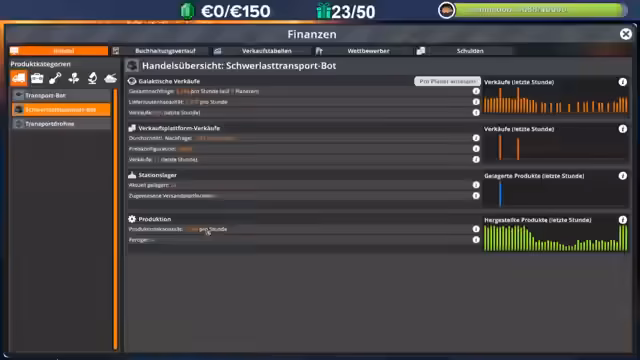 01:05:44Die erste Fertigungsstrecke für Transportdrohnen ist nun betriebsbereit und produziert die Bots ausschließlich aus zugekauften Rohstoffen. Der Streamer richtet Handelsrouten ein, um die produzierten Drohnen zu verkaufen. Zunächst gibt es jedoch Probleme mit der Transportkapazität der Frachtschiffe, was zu einem Rückstau führt. Durch das Upgraden der Schiffe und das Reduzieren des Gewichts der Produkte wird der Vertriebsprozess optimiert, um die Abflüufe zu beschleunigen und den Profit zu maximieren.
