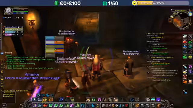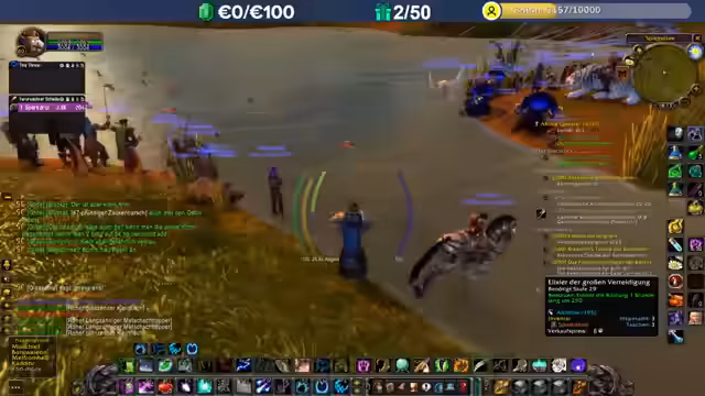 03:12:35Nach dem offiziellen Teil des Meetings sucht der Streamer nach einer Gruppe für einen Dungeon in der Nähe von Sturmwind. Er prüft seine Ausrüstung auf mögliche Upgrades und holt sich Rezepte für Tränke. Der Chat wird um Inputs gebeten, doch zunächst findet sich keine Gruppe. Daraufhin fliegt der Streamer in die Brennende Steppe, um dort Kräuter zu farmen. Die Gespräche im Chat drehen sich um die Effektivität von Welt-Buffs, während der Streamer weiterhin aktiv Items sammelt und handelt, um seine Vorbereitung für Level 60 fortzusetzen.