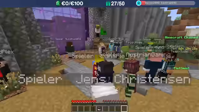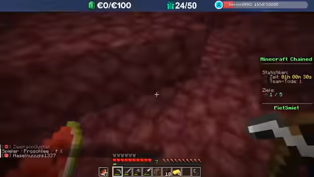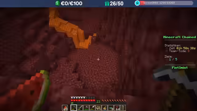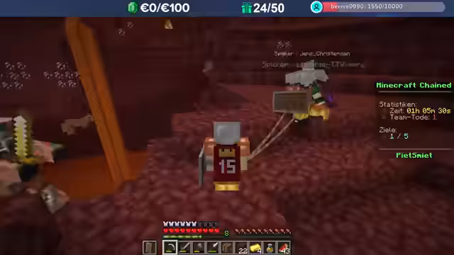 00:00:14Das LiveStream beginnt mit dem 'Piet's Meet Event' im Minecraft Chained-Modus. Vier Spieler - Jens, Ghost, Christensen und Lunari - sind miteinander verbunden und müssen vor 23 Uhr fünf Hauptziele erreichen: Den Enderdrachen besiegen, eine Wither Rose besitzen, alle Level 30 sein, Nautilus 10 vollbringen und je 30 Erfolge erreichen. Sie bilden eine Kette, bei der Bewegungen alle Spieler beeinflussen, was die Herausforderung erhöht.
