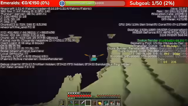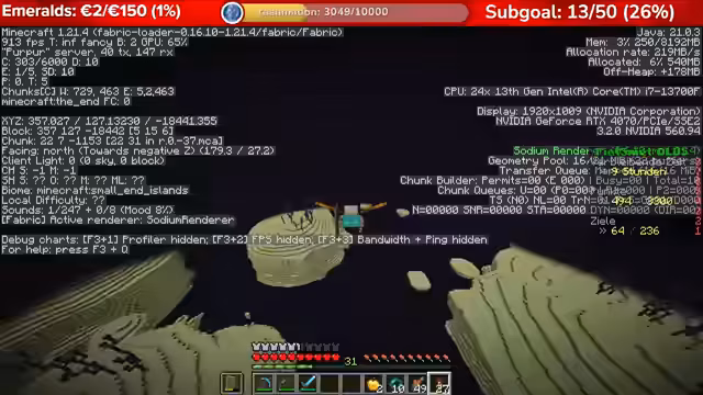 00:01:23Das Ziel des Streams ist es, in die Top 5 zu gelangen und 1000 Punkte zu erreichen. Aktuell befindet sich das Team auf Platz 8. Es wird geplant, NCDs (vermutlich Non-Player Character Dungeons) zu looten, um zwei gute Equipment-Sets zu erhalten. Ein Problem ist, dass das Resource-Pack auf dem Server die Sprache auf Deutsch stellt, was für den Streamer ungewohnt ist und die Orientierung erschwert. Der Streamer möchte eine weitere End-City finden, um Deer-Equipment zu sammeln, in der Hoffnung, dass die Haltbarkeit dieses Mal besser ist. Die Strategie besteht darin, geradewegs in eine Richtung zu fliegen, um effizient voranzukommen. Der Streamer hat bereits eine Elytra gefunden und möchte diese gegen eine neue eintauschen, da es bereits viele Spieler im End gibt. Es wird die positive Z-Koordinate angepeilt, um voranzukommen.