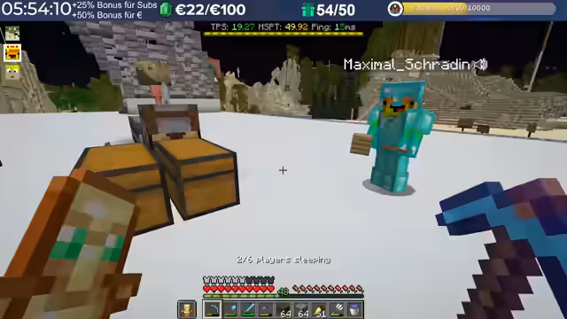 Der Minecraft-Livestream zeigt die Teilnehmer nach 19 Tagen am Limit ihrer Kräfte. Organisatorische Schwierigkeiten und Meinungsverschiedenheiten unter den Spielern werden thematisiert. Eine kürzere Spielzeit ist geplant, während die Gruppe Andesit abbaut und sich auf die Suche nach Netherite vorbereitet. Ein Minispiel scheitert an Servereinstellungen. Die Rückkehr eines gebannten Spielers und die Effektivität von In-Game-Strafen werden diskutiert. Im Hintergrund belasten ernstere Themen die Spieler.