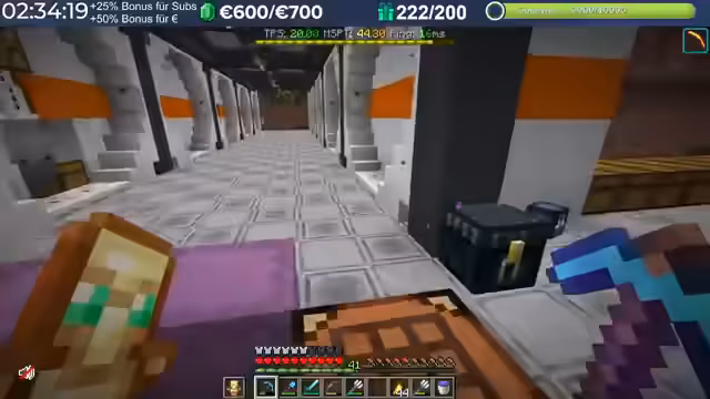 00:32:42Ein Teilnehmer namens Klim hat einen exklusiven Deal über 250 Euro für das Farmen von 20.000 Kupfer-Erz abgeschlossen. Der Streamer erklärt, dass diese Art von Echtgeld-Deals nun nicht mehr geduldet werden. Das angesammelte Geld, welches den Serverkauf finanzieren soll, wurde in Full-Netherite-Rüstungen und einen Sattel umgewandelt. Er stellt klar, dass solche Transaktionen nicht fair im Sinne der Community sind und nur im äußersten Notfall, wie bei einem Drachenei, erwogen werden würden.