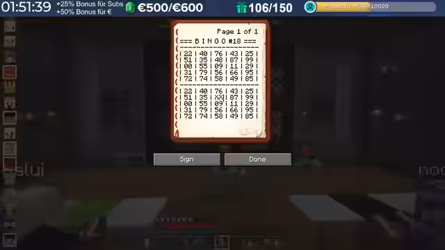 18:39:38Die Bingo-Runde geht mit einem neuen Spiel um das Erreichen eines X-Musters auf dem Schein weiter. Nachdem ein Spieler zunächst falsch als Gewinner gemeldet wurde, wird offiziell ein anderer Spieler zum Sieger gekürt. Die Anforderungen für das X werden präzisiert: es muss sich diagonal von links oben nach rechts unten sowie von rechts oben nach links unten erstrecken und die Mitte beinhalten. Die Eskalation unter den Teilnehmern bleibt ein humoristischer Aspekt des Spiels.