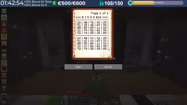 19:07:19Nach einer intensiven und chaotischen Bingo-Runde, in der ein Spieler ein „X“ auf seinem Schein erzielt und damit gewinnt, endet das offizielle Bingo-Event. Die Spieler verabschieden sich humorvoll und die Organisatoren bedanken sich für die Teilnahme. Es wird kurz über die gewonnenen Preise gesprochen und die Möglichkeit, die Bingo-Scheine zu behalten. Nach dem Ende des Events wendet sich der Streamer einem anderen Thema zu: einem eigenen Minigame, das sie gebaut haben. Es gibt jedoch ein technisches Problem: Man kann auf dem Server keine Items angeln, was das Minigame unspielbar macht. Der Streamer erklärt, dass dieses Problem im Einzelspieler-Modus nicht auftritt und vermutet, dass es an einem Server-Setting liegt, das überprüft werden muss. Trotz dieses Rückschlags bleibt die Hoffnung, das Minigame in Zukunft zum Laufen zu bringen. Der Streamer reflektiert über die Herausforderung, gleichzeitig die Basis zu pushen und Events zu organisieren, und schließt den Abschnitt mit einem Ausblick auf weitere Bauprojekte und die Lösung des technischen Problems.