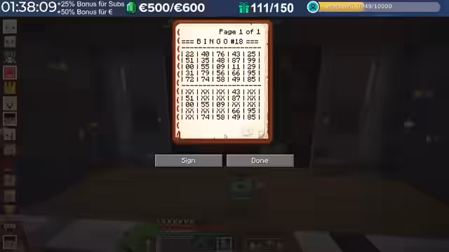 18:16:52Die Teilnehmer spielen ein Bingo-Spiel mit Zahlen zwischen 0 und 99. Die Regeln sind anfangs unklar, insbesondere ob diagonal gezählt wird. Es kommt zu Verwirrung, als ein Spieler ein Bingo meldet, aber die Zahlen nicht korrekt durchgestrichen haben. Ein anderer Spieler wird zum offiziellen Rentner ernannt, was einen bestimmten Spielzeitraum für Craft Attack ermöglicht. Die Stimmung ist hektisch und chaotisch, mit vielen technischen Fragen und Unstimmigkeiten über die Regeln des Spiels.