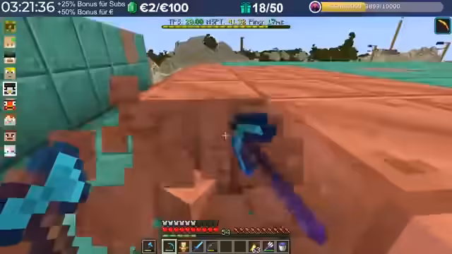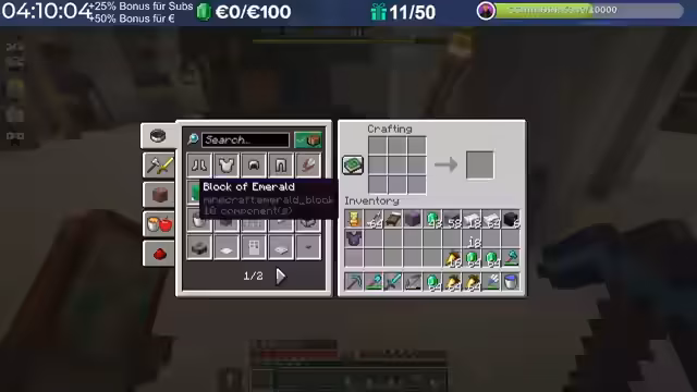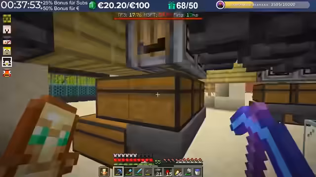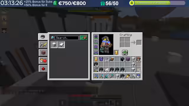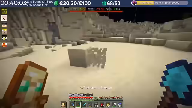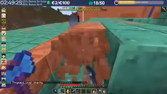 20:04:58Nach dem Trimax-Event wird die Übergabe der gesammelten Diamantblöcke an die Spieler organisiert. Jeder 500. Block wird in einen realen Euro-Wert umgerechnet. Die gespendete Summe wird auf 6.800 Euro beziffert, was für einen guten Zweck gespendet wird. Der Streamer lobt die Aktion und den Eifer aller Teilnehmer. Anschließend werden die Diamantblöcke verarbeitet, um Material für das Bauvorhaben der Golems zu gewinnen.