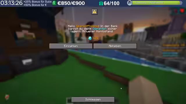 02:07:28Das neue Banksystem wird im Spiel vorgestellt und erklärt. Die Funktionsweise, das Einzahlen von Diamanten und Anzeige der Highscores wird live demonstriert. Die Stimmung schlägt jedoch um, als es zu einem Streit zwischen Spielern kommt. Early Boy baut ohne Erlaubung Blöcke eines anderen Spielers ab, was zu einem heftigen Konflikt und Diskussion über Fairness und Regeln auf dem Server führt.