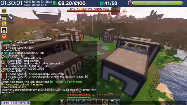 19:08:25Der Streamer klärt die Server-Regeln und die Rollenverteilung im Team. Es wird erklärt, dass Blöcke, die von den Organisatoren Farbo und Magst platziert wurden, mitgenommen werden dürfen, während Material von anderen Teilnehmern tabu ist. Die Position der NXP-Farm wird kommuniziert, die von allen genutzt werden kann, während man auf ein Reparatur-Werkzeug wartet. Zudem wird die Altersstruktur der Teilnehmer erwähnt, mit Spielern im Alter von 19 bis 56 Jahren.