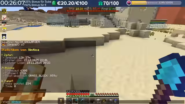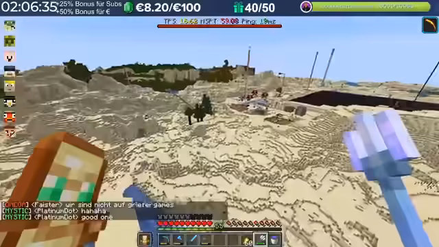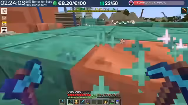 06:26:10Ein Charity-Event läuft, bei dem Kupferblöcke abgebaut werden können, um Spenden für Kinderlachen zu sammeln. Für jeden abgebauten Block werden 10 Cent gespendet, was einen Stack von 64 Blöcken auf 6,40 Euro kommen lässt. Die Teilnehmer arbeiten als billige Arbeitskräfte, wobei das gesammelte Geld direkt an den Zweck geht und nicht an die Organisatoren. Die erste Zielsumme lag bei 5.000 Euro, was 50.000 Blöcken entspricht, wobei die Teilnehmer auch persönliche Ziele wie 500 Euro nannten. Einige Teams bilden sich, um den Abbau zu beschleunigen.