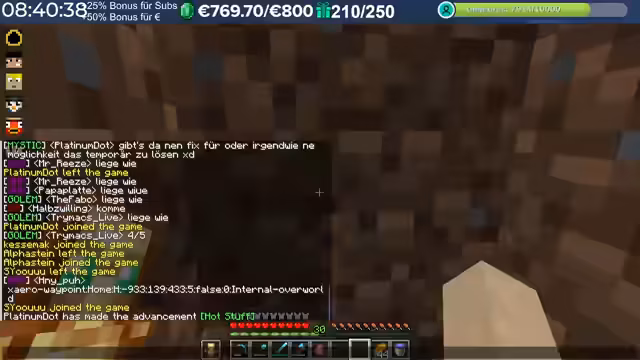 15:15:34Es werden technische Probleme im Stream thematisiert, darunter Serverlags und Verbindungsprobleme, die dazu führen, dass Spieler aus dem Spiel geworfen werden. Ein Spieler, Fabo, wird als Frühwarnsystem für Serverabstürze bezeichnet, da er oft als Erster betroffen ist. Es wird eine Diskussion über die Effizienz von Ancient Debris Farming geführt, wobei TNT als die überlegene Methode gegenüber Betten hervorgehoben wird. Ein Streamer berichtet, wie er in Craft Attack 8 alleine einen riesigen Krater gesprengt und eine Creeper-Farm gebaut hat, um 70.000 Gunpowder pro Stunde zu produzieren, was für das Farmen von Netherite genutzt wurde. Die Idee, eine TPS-Bar (Ticks Per Second) im Spiel anzuzeigen, wird diskutiert, um die Serverleistung zu überwachen, obwohl betont wird, dass die TPS des Servers fast immer stabil bei 20 liegt und Probleme eher auf Netzwerk- oder Spielerseite zu suchen sind. Es wird auch überlegt, wie Ghasts in Minecraft schneller gemacht werden könnten, um eine Ghast-Autobahn zu bauen, wobei Speed Potions und Beacons als mögliche Lösungen genannt werden.