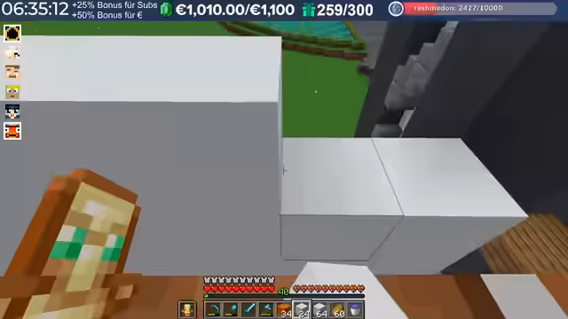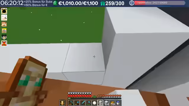 05:47:02Ein Spieler namens „Yo“ stößt zum Stream hinzu und wird herzlich begrüßt, wobei die Freude über ein persönliches Treffen ausgedrückt wird. Es wird über den Fortschritt beim Bau von Concrete gesprochen, insbesondere über die Menge an grauem Concrete, die für die Halle benötigt wird. Ein Zuschauer namens Fresh Bird spendet 10 Euro, und die verbleibende Stream-Zeit wird auf 8,5 Stunden geschätzt. Die Spieler diskutieren über die Herstellung von Light Grey Concrete und die effizienteste Methode, Concrete Powder in Concrete umzuwandeln. Dabei werden verschiedene Techniken besprochen, darunter das Platzieren von Wasserquellen und das gleichzeitige Drücken von Rechts- und Linksklick. Es wird auch über die Notwendigkeit von Wither-Köpfen für einen Beacon gesprochen, und die Spieler tauschen sich über ihre Erfahrungen im Spiel aus, wobei der Streamer überrascht feststellt, dass er noch nie den Enderdrachen besiegt hat, da er hauptsächlich Minispiele und PvP gespielt hat. Die Diskussion über Spinnenspawner und die Notwendigkeit von Spinnenaugen für die Vermehrung von Amodinos führt zu der Entdeckung von zwei Giftspinnenspawnern in der Nähe.