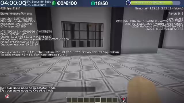13:18:34Die Streamer arbeiten an der Verbesserung ihrer Ressourcenfarmen, insbesondere bei der Farmung von seltenen Materialien wie Froglights. Es werden technische Lösungen wie Comparator-Systeme entwickelt, um die Effizienz der Farmen zu erhöhen und den automatisierten Betrieb zu optimieren. Diese Fortschritte sind entscheidend, um die nötigen Ressourcen für die großen Bauprojekte in ausreichender Menge zu beschaffen und die Produktivität zu steigern.