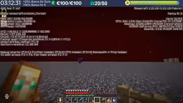 03:39:50Ein Spieler bewertet die aktuelle Season als enttäuschend, da er das Gefühl hat, übergangen zu werden und viel vorbereiten zu müssen. Es wird diskutiert, ob die Kupferfarm im Verhältnis zum Abbau von Blöcken in Trial Chambers wirklich so viel bringt. Ein Update oder Bug-Tracker deutet darauf hin, dass Kupferfarmen drastisch generft werden könnten. Die Effizienz von Trial Chambers wird gelobt, wobei ein Spieler alleine auf Jagd geht. Die Größe von Trial Chambers wird als unterschiedlich und zufällig beschrieben, und es wird erwähnt, dass der 'Superdrunk'-Trank ebenfalls zufällig droppt. Ein Spieler geht alleine auf Trial-Chamber-Jagd im Nether, was als riskant, aber lohnenswert beschrieben wird. Die Möglichkeit, eine Farm aus Trial Chambers zu bauen, wird diskutiert, um die Spawner zu automatisieren und Loot zu erhalten, wobei jedoch nur Müll und kein Kupfer herauskommt. Die Trial Chamber unter der Basis eines Spielers wurde abgebaut, obwohl sie markiert war.
