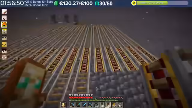10:49:30Die Beschaffung von Materialien für die geplanten Farmen erweist sich als größere Herausforderung als erwartet. Insbesondere für die Powered Rails werden erhebliche Mengen an Gold benötigt, etwa 260 Goldbarren, was über vier Stacks Golderz entspricht. Da die vorhandenen Ressourcen nicht ausreichen, muss eine Goldfarm gebaut werden. Es wird überlegt, ob es möglich ist, Gold zu 'dupen' (duplizieren), was jedoch als verboten abgelehnt wird, außer bei bestimmten TNT-Glitches. Die Streamer planen, Magma-Blöcke für den Bau einer Goldfarm zu sammeln. Auch Kürbisse für Eisengolems und Redstone für Komparatoren und Rails sind erforderlich. Die Aufgabe wird aufgeteilt: Ein Streamer kümmert sich um das Schmelzen und Vorbereiten der Materialien, während der andere Gold im Nether farmt und andere benötigte Gegenstände besorgt. Der Bau der Farmen beginnt mit dem Sammeln von Baublöcken und dem Aufstellen von Kisten für die Lagerung.