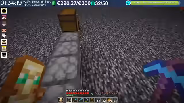 03:33:11Die Kaktusfarm ist kaputt, da jemand Dreck in die Schmelze getan und den Hopper verstopft hat. Dies führt zu Frustration, da die Farm nach 48 Stunden AFK keine XP liefert. Die Schuldfrage wird diskutiert, wobei ein Spieler sich zu 80% sicher ist, dass ein anderer Spieler dafür verantwortlich ist. Die Amadello-Farm wird als Alternative zur Kaktusfarm vorgeschlagen, obwohl ein Spieler sie nicht mag. Die Notwendigkeit von Tränken für die XP-Farm wird thematisiert, und es wird diskutiert, wie diese Ressourcen beschafft werden können. Ein Spieler erhält die Information, dass die Farmen trotz Lags weiterlaufen, aber das Öffnen von Kisten beeinträchtigt ist. Die Serverprobleme werden als regionsbedingt eingeschätzt, wobei einige Spieler stark betroffen sind und andere nicht. Die Schwierigkeit, 1000 Tränke herzustellen, wird angesprochen, und es wird festgestellt, dass nur wenige Tränke gleichzeitig benötigt werden. Die Kaktusfarm ist weiterhin ein Problem, da sie leer ist und nicht funktioniert, was zu großer Enttäuschung führt.