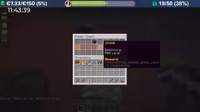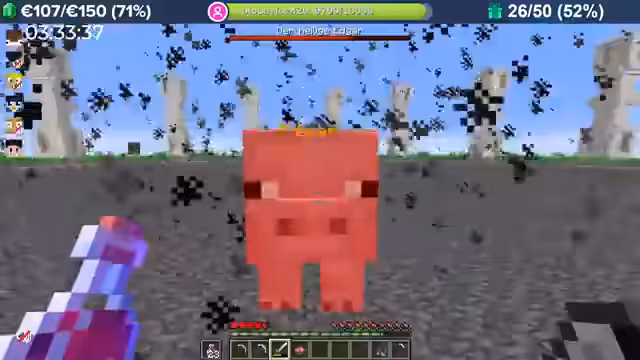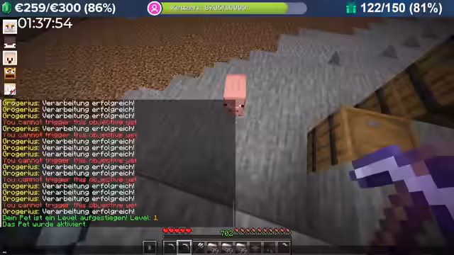 18:01:18Nach erfolgreichem Grind wird das Pet-System vorgestellt. Das Pet wird im Menü der Enderkiste verwaltet, kann aktiviert und beliebig oft deaktiviert werden. Ein aktives Pet sammelt durch Aktivitäten wie Bergbau oder Angeln separate Erfahrung, die es leveln und somit stärker machen kann. Zunächst sind die Boni noch gering, aber das gezeigte Schwein-Pet bereits ein zusätzlicher Schaden, was vier Combat-Level entspricht. Es werden verschiedene Pets angedeutet, deren Fähigkeiten und Herkunft (Angeln, Bosskills) bleiben vorerst geheim.