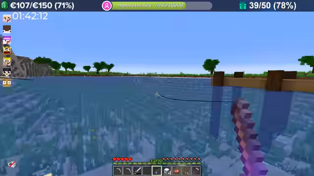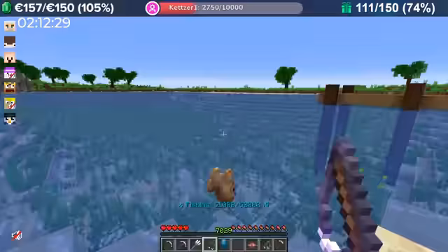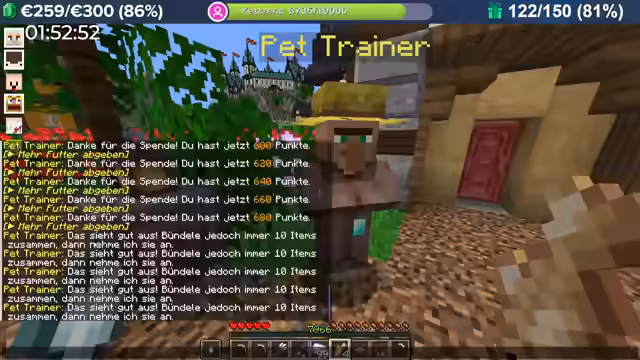 06:00:34Das Hauptziel für den Streamer ist das Freischalten seines gekauften Pets. Hierfür sammelt er gezielt Fische, um sie bei einem Pet-Trainer abgeben zu können. Parallel dazu beginnt er, große Mengen an Eisen und Amethyst umzuwandeln, um die Ressourcen für den Golem zu beschaffen und so die Pet-Freischaltung voranzutreiben.