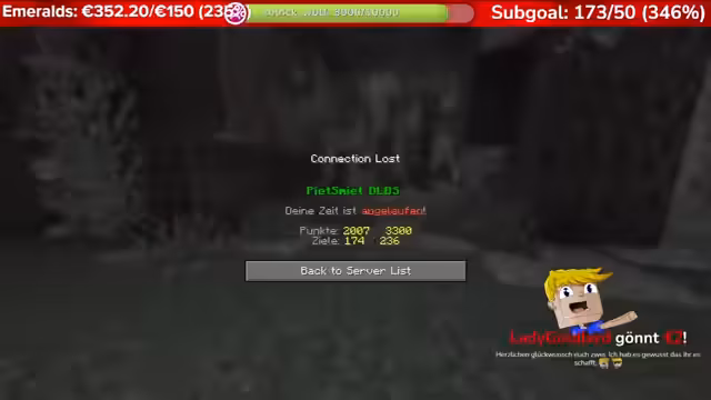 05:07:15In den letzten Minuten versuchen die Spieler, verbleibende, schnell umsetzbare Achievements zu erreichen, wie das Herstellen einer Angel oder das Reiten auf einem Strider im Nether. Obwohl einige Ziele wie das Finden eines Meadow-Bioms oder einer Ziege verpasst werden, gelingt es ihnen durch das Angeln eines Fisches und das Reiten auf einem Strider, ihre Punktzahl auf 2007 zu steigern. Dies wird als absoluter bahnbrechender Erfolg und Erreichen des Hauptziels gewertet.