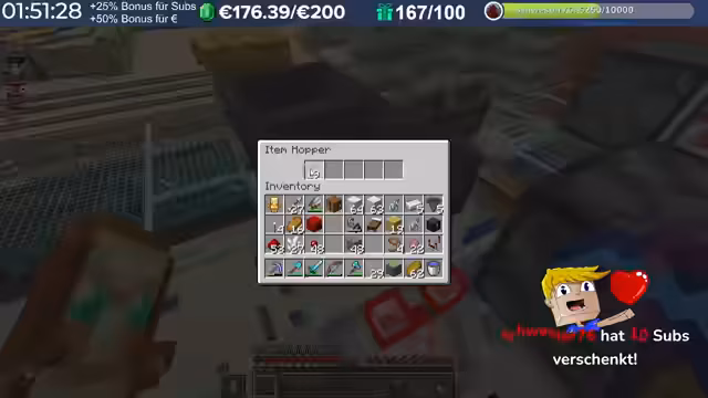 04:14:43Ein zentrales Ereignis ist der Bau und die Optimierung einer hochkomplexen Schleim-Farm. Diese Farm nutzt Amadillos, die durch einen Zombie permanent Schaden nehmen, sodass unendlich viele Silberfische spawnen. Diese werden durch einen Oozing Trank in Schleime verwandelt. Das System wird mit Hoppern, Uhren und Trichtern automatisiert, um eine ständige und effiziente Produktion zu gewährleisten.