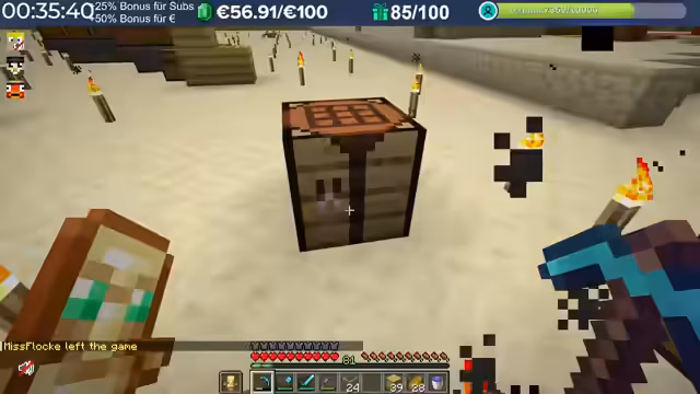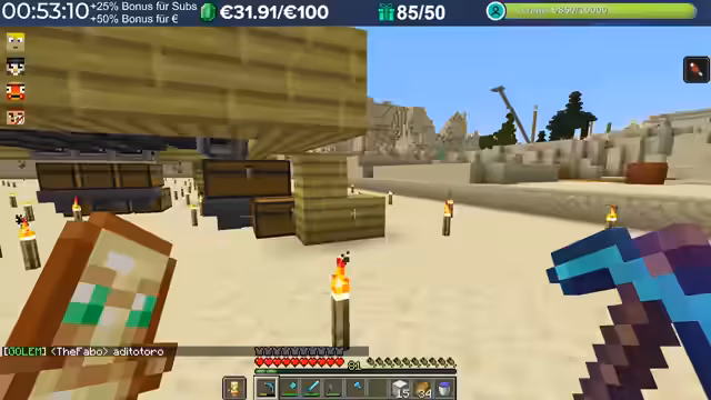 06:22:18Die XP-Farm erleidet einen plötzlichen Ausfall, da alle Armadillos verschwunden sind. Mögliche Ursachen wie Chunk-Grenzen oder Serverversionen werden diskutiert. Für den Wiederaufbau werden Spinnenaugen benötigt, weshalb Hilfe von anderen Spielern wie Fuchsel angefordert wird. Zuerst erhält man drei Stacks, doch aufgrund von Ertragsschwankungen wird über die Platzierung der Farm und die Nähe zu anderen Mobs nachgedacht. Man plant, sich bei Feli an deren Farm zu positionieren.