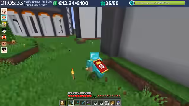 04:53:49Der Streamer interagiert stark mit der Community. Andere Spieler wie "Fabo" und "Gas" werden erwähnt und eingebunden. Fabo baut ein Haus um die Farm. Der Streamer kündigt an, dass die Community-Server noch Anmeldungen offenhalten, da sie gut besucht sind. Es wird auch über ein persönliches Projekt gesprochen: eine Bank-UI, die er selbst entwickelt hat, um Diamanten sicher zu lagern und zu verwalten.