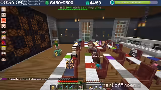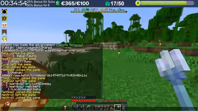 14:48:54Es wird eine Frage zur Beschleunigung des Happy Ghasts auf dem Community Server beantwortet. Anstatt eines Enchantments kann der Happy Ghast durch das Füttern von 16 Schneebällen schneller gemacht werden, was über ein spezielles Menü (Taste G) zugänglich ist. Dieses Feature wurde bereits implementiert, obwohl ursprünglich auch ein Enchantment-Ansatz diskutiert wurde. Der Streamer betont, dass das Ergebnis dasselbe ist, unabhängig davon, ob es über ein Menü oder ein Enchantment realisiert wird. Im weiteren Verlauf des Streams wird die Server-Performance thematisiert. Es wird festgestellt, dass die TPS-Werte niedrig sind, was auf die hohe Anzahl von Entities und Mobs auf dem Server zurückgeführt wird. Nach Wochen, in denen jeder Spieler seine Farmen ohne Rücksicht auf Performance aufgebaut hat, macht sich dies nun bemerkbar. Es wird vorgeschlagen, für zukünftige Craft Attack-Events eine zentrale Villager Trading Hall zu implementieren und Farmen so zu gestalten, dass sie bei Nichtgebrauch abschaltbar sind, um die Serverlast zu reduzieren. Es wird auch die hohe Anzahl von Tieren auf dem Server kritisiert, die zur schlechten Performance beitragen.