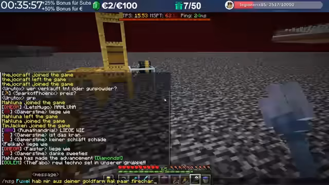 16:16:16Es wird ein Handel mit Gunpowder und Spinnweben besprochen. Der Streamer benötigt Gunpowder und Spinnweben für seine Projekte. Ein anderer Spieler bietet fünf Stacks Gunpowder an und verlangt dafür zwei Diablöcke, was als fairer Preis akzeptiert wird. Die Herkunft des Gunpowders wird geklärt: Es stammt von einer Ghast-Farm, die ursprünglich für Ghast-Tränen gedacht war, aber aufgrund der leichten Verfügbarkeit durch Gold-Tauschhandel nun primär Gunpowder liefert. Zusätzlich werden Spinnweben benötigt, etwa fünf bis zehn Stück, die ein anderer Spieler vorbeibringen möchte. Die Koordination des Treffpunkts erfolgt über die Base des Streamers, wo die Armadillos stehen.