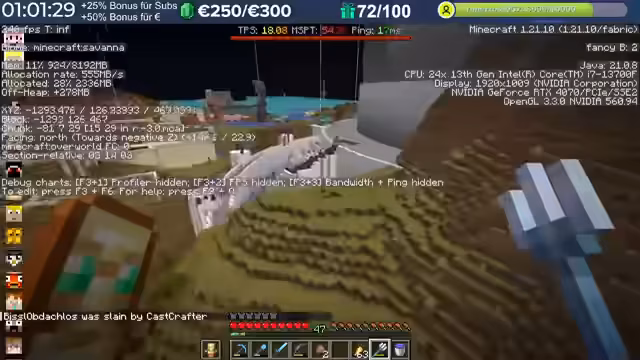 04:00:42Im Gespräch kommt die Server-Performance zur Sprache, da ein Spieler über starke Lags und einen hohen Ping klagt. Es wird erklärt, dass die Mob-AI in Minecraft Probleme verursachen kann, wenn zu viele Entities vorhanden sind, was zu einem Rückgang der TPS (Ticks per Second) führen kann. Nach einem Update, das die Optimierung der Performance wieder herausgenommen hat, ist die TPS auf etwa 15 gesunken, liegt aber aktuell bei 19,7, was als 'eigentlich recht gut' bewertet wird. Der hohe Ping des Spielers wird als Ursache für seine Probleme identifiziert, und es wird vermutet, dass es sich um Routing-Probleme oder Internetknoten zwischen dem Spieler und dem Server handeln könnte. Es wird vorgeschlagen, dass der Spieler beobachtet, ob sich die Situation bessert, und gegebenenfalls den Administrator kontaktiert, um eine IP-Whitelisting oder ähnliches zu prüfen.