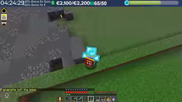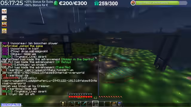16:20:28Ein Vorfall überschattet den Stream: Die Villager-Farm wurde mit TNT zerstört. Durch Plugin-Analysen wird festgestellt, dass der Nachbar Schradin für die Zerstörung verantwortlich ist. Dieser gibt an, es sei ein Unfall während einer Testsprengung gewesen, da er die Farm nicht als solche erkannt habe. Nach einer Konfrontation einigt man sich, dass es sich um ein Missverständnis handelte und der Vorfall nicht wiederholt wird.