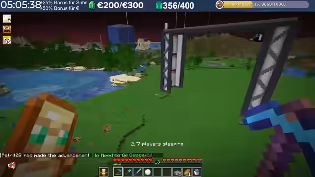 17:15:43Es wird über den Bau einer Enderpearl-Farm gesprochen. Die Teilnehmer diskutieren die Machbarkeit und den genauen Standort des Portals, das eine direkte Verbindung zur Farm ermöglichen soll. Es gibt eine Debatte über die Verfügbarkeit von Ressourcen wie Enderperlen und der dafür notwendigen Vorbereitung. Auch ein geplantes Projekt, das eine Verbindung über die Decke ermöglicht, wird besprochen.