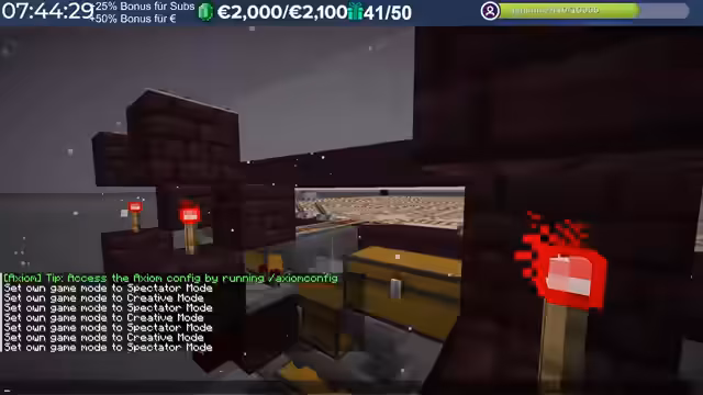 01:08:45Ein ernsthaftes technisches Problem tritt auf: Die Ender-Chests des Streamers sind beschädigt und unzugänglich. Noch schlimmer ist, dass seine Allays, die zur Materialbeschaffung eingesetzt werden sollten, verschwunden sind. Nach einer Analyse wird dies auf einen Server-Bug zurückgeführt, bei dem Passive Mobs wie Allays in bestimmtenChunks spawnen können, obwohl sie es eigentlich nicht dürften, und dabei sterben können.